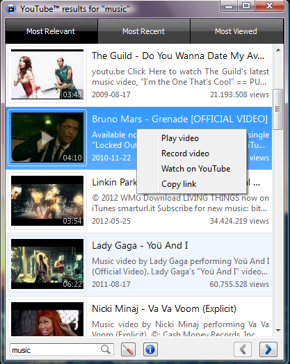 Very useful program for those who work with Youtube videos. It can search Youtube and run your own app to playback videos found. I've set up it to run Mp4 Video 1 Click for Windows (search sourceforge or google it). The latter program converts any video into standard mp4/h264 and enhances brightness and loudness automatically.