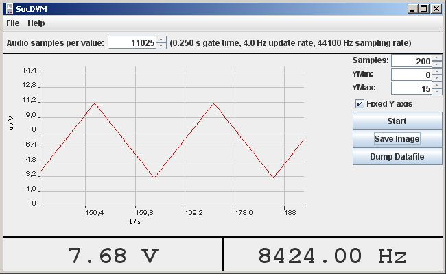 With this software and a simple external hardware, the sound card input of a PC can be used to measure stationary or slowly changing analog signals (e.g. voltages). The hardware converts the input signal into a voltage proportional frequency. The software measures the frequency via the sound card and calculates the corresponding input signal level which is displayed numerically and in a “scope-like” view.