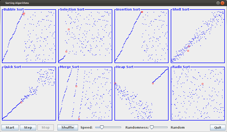 This is a small Java swing application that shows different sorting algorithms working on the same set of data. The user can modify the speed of execution and the type of data to sort and execute it step by step. The tooltip of each algorithm's box shows the source code that is executed and a little explanation got from wikipedia.