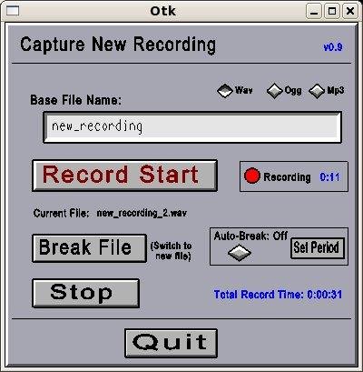 Simple GUIs to record and edit sound files, similar to operating a tape-deck. Buttons start and stop recording, or break incoming audio into separate files. Cut sections from audio file, or join files. Saves files in WAV, OGG, or MP3.