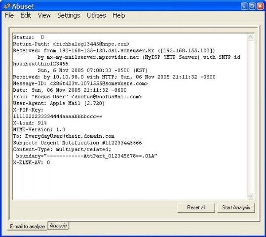 Abuse is a simple program that helps people fight spam. It will "read" any e-mail header you indicate, go on-line and check the various NICs, open relay DBs... prepare/send an email (lart) to the spammer's ISP in order for your voice to be heard.