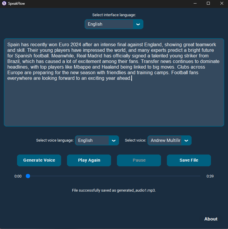 Excited to present SpeakFlow - an intuitive desktop application for Text-to-Speech (TTS) conversion! It allows you to easily transform entered text into high-quality audio files, using natural voices in many languages.