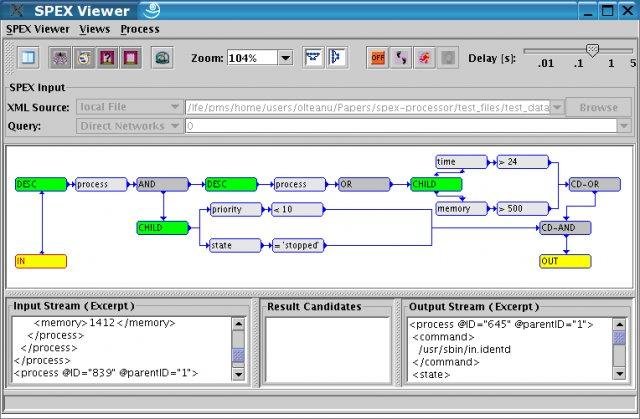 SPEX stands for Streamed and Progressive Evaluation of XPath queries. Streamed means the XML input is processed via a SAX-based interface and with a low memory footprint. Progressive means the query answer is delivered as soon as possible.