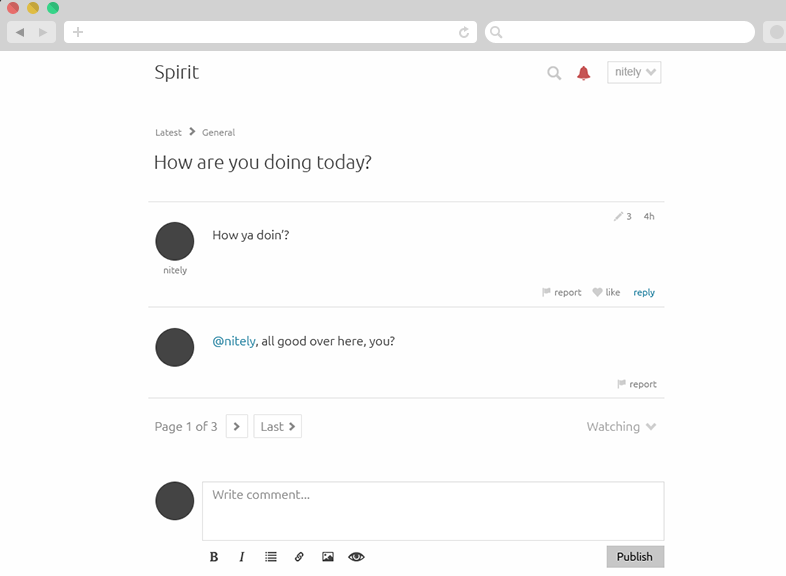 Spirit is a Python-based forum built using the Django framework. Receive an automatic notification every time someone mentions your @name, quotes you or answers to your conversation. Create your own private conversations and invite as many users as you want to it. Spirit automatically registers which was the last comment you read on a conversation. Spirit saves all edits made to your comments. Spirit automatically saves your unfinished comments so you can complete them later. Highlight any comment you want with a "like." Spirit is mobile-first, it's meant to work in the same way in any given device. The code has been written on python employing django's framework and it can be easily integrated to pre-existing projects. Spirit is part of the open source initiative, and it's a project released under the terms of the MIT license.