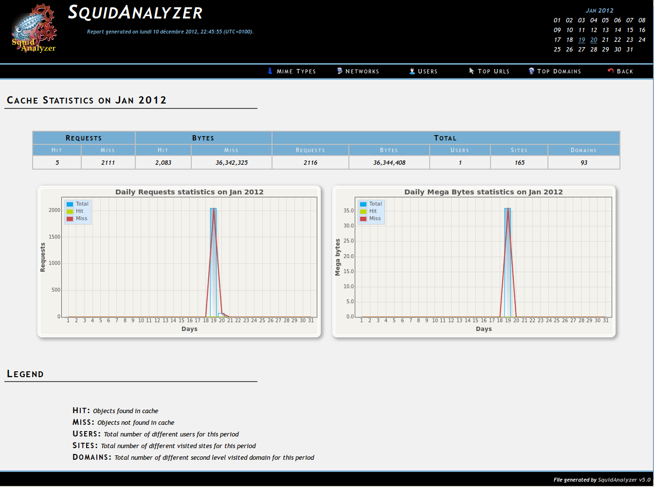 Squid Analyzer parses Squid proxy access log and reports general statistics about hits, bytes, users, networks, top URLs, and top second level domains. Statistic reports are oriented toward user and bandwidth control.