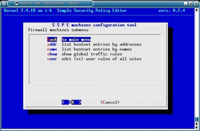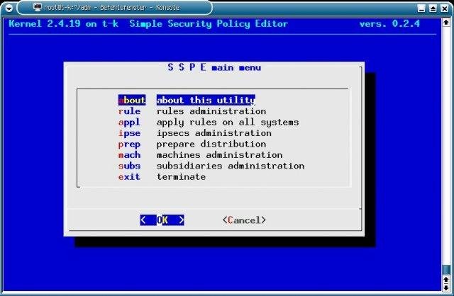 SSPE: Simple Security Policy Editor is a simple distributed firewall with an central ascii administration. It uses two plain manually edited ascii-files and some other, static files for each of the target-machines to generate iptables.