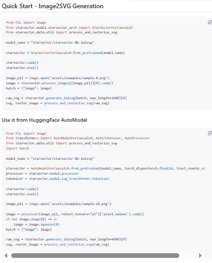 StarVector is a multimodal foundation model designed for generating Scalable Vector Graphics (SVG) from images or textual descriptions. The system treats vector graphics creation as a code generation problem, producing SVG code that can render detailed vector images. Its architecture combines computer vision techniques with language modeling capabilities so it can understand visual inputs and textual prompts simultaneously. The model converts raster images or text instructions into structured vector representations, enabling high-quality vectorization and design generation. This approach allows StarVector to create scalable graphics that maintain visual quality regardless of resolution, which is especially useful for design tools and illustration workflows. Because the model produces SVG code rather than pixel images, the output can be edited programmatically or integrated directly into web and design environments.