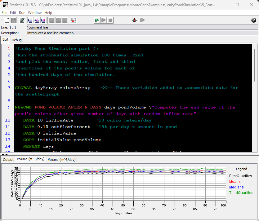 Statistics101 is an Integrated Development Environment (IDE) that uses a simple, powerful language called “Resampling Stats” to develop Monte Carlo programs to analyze and solve statistical problems. The original Resampling Stats language and computer program were developed by Dr. Julian Simon and Peter Bruce as a new way to teach Statistics to social science students. Of course, social science students aren't the only ones who can benefit. Anyone who wants to learn statistics will find that the resampling approach helps in understanding statistical concepts from the simplest to the most difficult. In addition, professionals who want to use resampling, bootstrapping, or Monte Carlo simulations will find Statistics101 helpful.