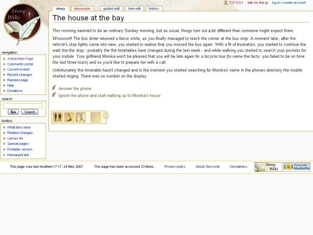 StoryWiki is a new kind of Wiki-engine, based on the approved MediaWiki, that enables everyone to play, create and modify non-linear storys in a collaborative way.