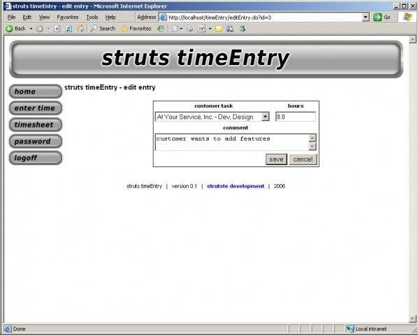 struts timeEntry is an application that developers can refer to when learning Apache's Struts framework. It should aid the learning developer in putting different Struts techniques into context.