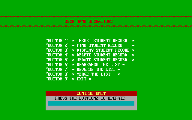 Student Management System is my first semester ITC (Introduction to Computer science) course project written in PASCAL language for my class fellows Syed Taqi Zaidi and Muhammad Minhaj. It uses linked-list data-structure to store student records. Also it uses BGI graphics in order to display colorful user-interface.