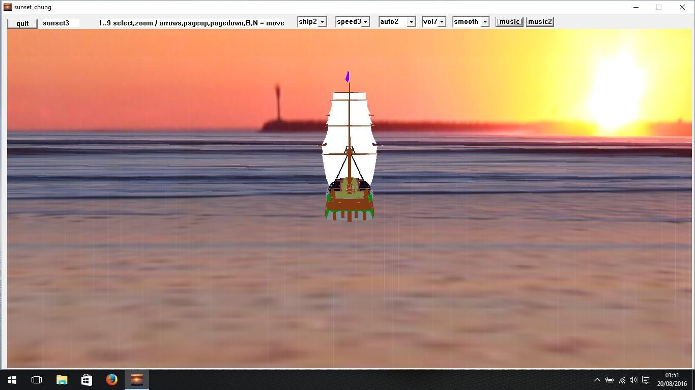 sunset chung is a sunsets / sunrise / noon / sky ocean openGL displays with moves, waves , zoom and sound , and animated water sea (calculated by texture algorythm , source included in the zip file)