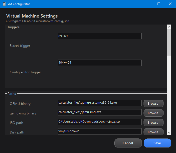 Sus Calculator is a Windows desktop calculator with a hidden VM trigger. It behaves like a standard calculator, but when a secret expression is entered, it launches a QEMU virtual machine using settings from a JSON config file. A second secret expression opens a modern configuration GUI.