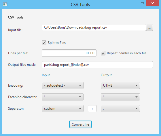 Simple tool for converting CSV file. You can easily change file encoding, escaping or separator character. You can split the file into more smaller files as well.