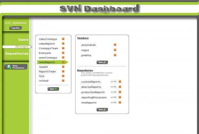 New v1.1.3.140 - Now includes a DB script! Managing SVN rights for multiple repos mirrored at multiple locations can be a daunting task. svnDashboard provides a simple, web-based, AJAX-enabled user interface for managing Several repositories and users.
