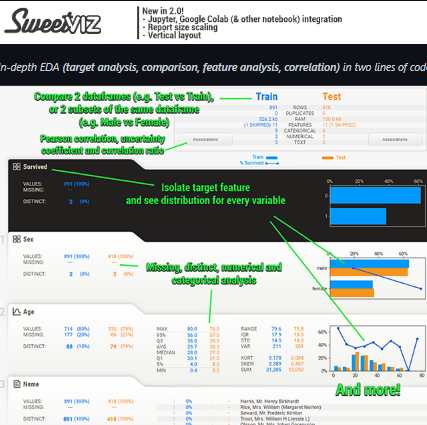 Sweetviz is an open-source Python library that generates beautiful, high-density visualizations to kickstart EDA (Exploratory Data Analysis) with just two lines of code. Output is a fully self-contained HTML application. The system is built around quickly visualizing target values and comparing datasets. Its goal is to help quick analysis of target characteristics, training vs testing data, and other such data characterization tasks. Shows how a target value (e.g. "Survived" in the Titanic dataset) relates to other features. Sweetviz integrates associations for numerical (Pearson's correlation), categorical (uncertainty coefficient) and categorical-numerical (correlation ratio) datatypes seamlessly, to provide maximum information for all data types. Automatically detects numerical, categorical and text features, with optional manual overrides. min/max/range, quartiles, mean, mode, standard deviation, sum, median absolute deviation, coefficient of variation, kurtosis, skewness.