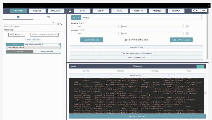 Your one-stop shop for sending, monitoring, and testing RESTful, gRPC, GraphQL, Websocket, OpenAPI, WebRTC, Webhooks, and streaming API requests. Now with Stress testing and Mocking. Swell supports full HTTP2 multiplexing of requests and responses. HTTP requests to the same host will be sent over the same connection. Swell will attempt to initiate an HTTP2 connection for all HTTPS requests by default, but will revert to HTTP1.1 for legacy servers. Multiple concurrent streams are allowed for each connection.