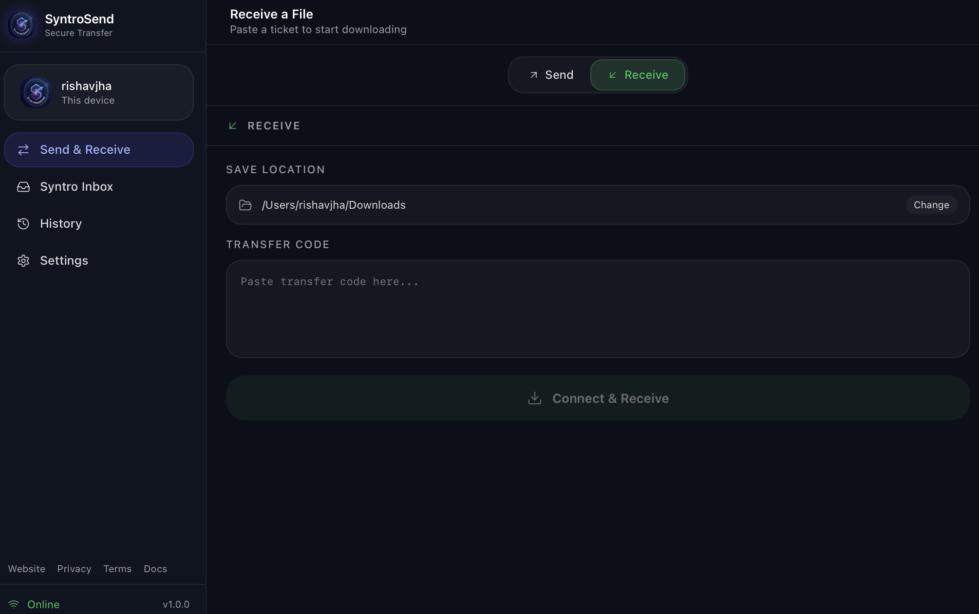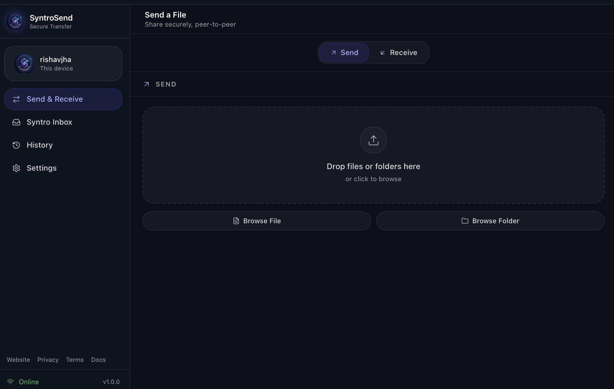 Built on modern P2P networking technology, SyntroSend allows users to transfer files locally over the same WiFi network or globally through encrypted tunnels. There are no file size limits, no account requirements, and no data stored on external servers.