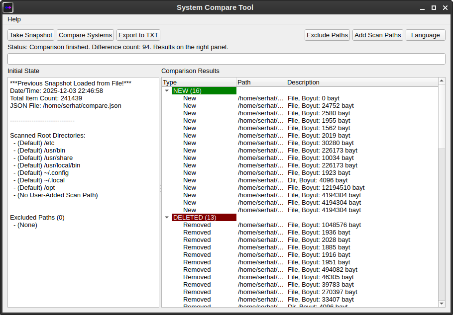 This small and lightweight application is a simple comparison tool that scans your system before making any changes, making it easy to track what happened after. After installing an application or performing an update, you can see what's in your system directories and which files' sizes have changed. You can add new file paths or exclude certain files from scanning. Github: https://github.com/shampuan/System-Compare-Tool