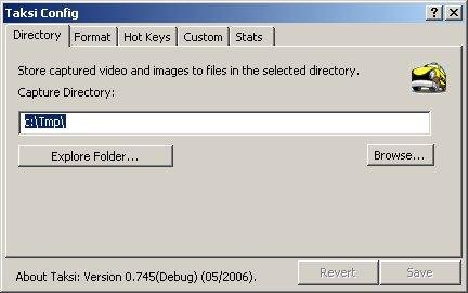 Taksi is a video capture/screen capture tool for recording 3D graphics applications (such as games). It can capture almost any windows application using DirectX, OpenGL, or GDI and create an AVI file using any installed VFW codec or still frames in PNG.
