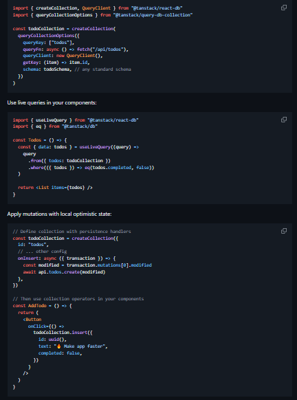 TanStack DB (beta) is a lightweight, embedded database-like library designed to manage structured data directly in client or server-side JavaScript environments, offering stateful data stores that work seamlessly with the TanStack ecosystem. Blazing‑fast query engine for sub‑millisecond live queries, joins & aggregates. Fine‑grained reactivity to minimize component re‑rendering. Robust transaction primitives for optimistic mutations with sync & lifecycle support. Normalized data model that keeps backends simple and consistent.