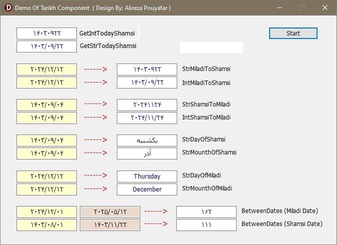 Tarikh component is prepared to convert solar date to Gregorian and vice versa and is able to provide the most accurate result in date conversion. Delphi Version (12)