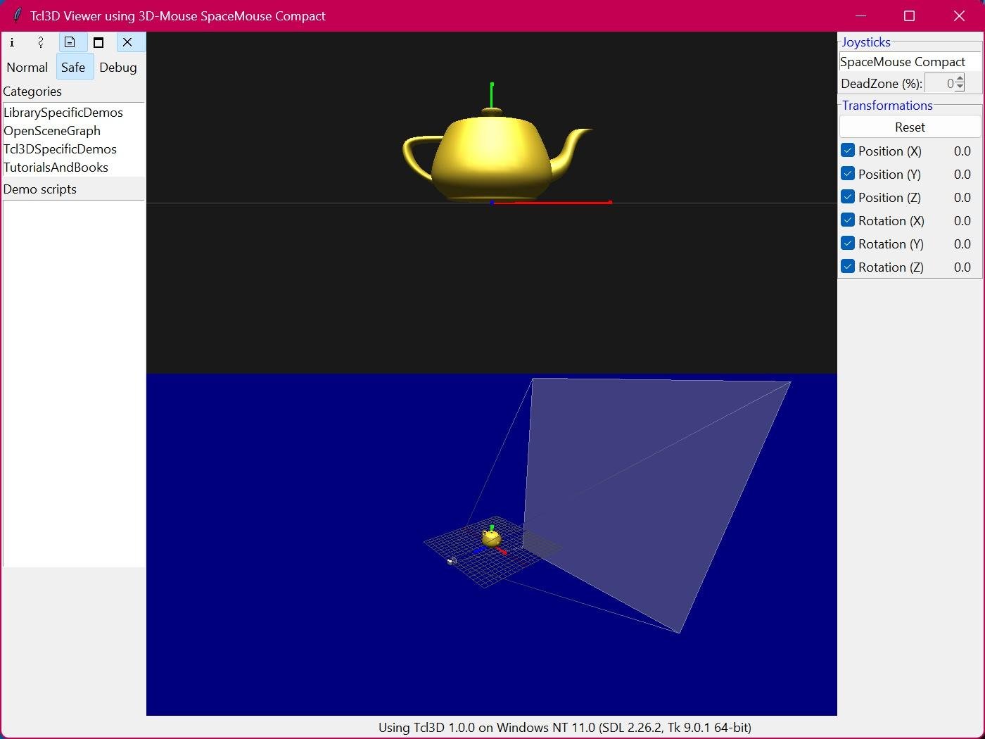 Tcl3D offers the 3D functionality of OpenGL and other 3D libraries at the Tcl scripting level.