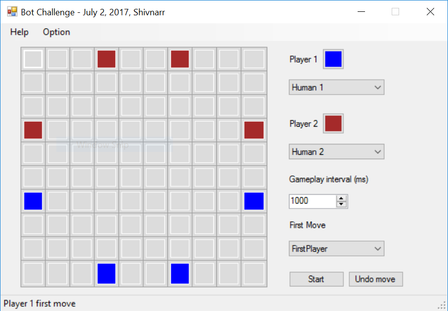 Game of the Giants is a two-player board game which is played on a 10x10 grid of cells. Each player has four giants having initial configuration as shown in starting stage.