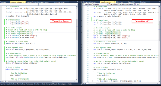 TensorFlow.NET (TF.NET) provides a .NET Standard binding for TensorFlow. It aims to implement the complete Tensorflow API in C# which allows .NET developers to develop, train and deploy Machine Learning models with the cross-platform .NET Standard framework. TensorFlow.NET has built-in Keras high-level interface and is released as an independent package TensorFlow.Keras. SciSharp STACK's mission is to bring popular data science technology into the .NET world and to provide .NET developers with a powerful Machine Learning tool set without reinventing the wheel. Since the APIs are kept as similar as possible you can immediately adapt any existing TensorFlow code in C# or F# with a zero learning curve. Take a look at a comparison picture and see how comfortably a TensorFlow/Python script translates into a C# program with TensorFlow.NET.