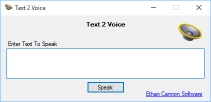 Text 2 Voice is a small program that allows you to enter anything into a text box, and your computer will speak it for you. You can use this program anywhere, including off USB sticks. Download now!