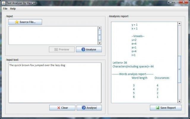 - Analyse given text files and displays a report which can be saved!