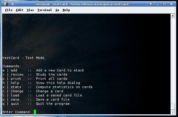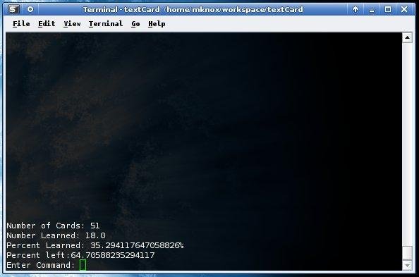 This program is a small text based java application that allows you to study flashcards. It includes the ability to save and load flashcards from a file, and gives you basic statistics about your studying.
