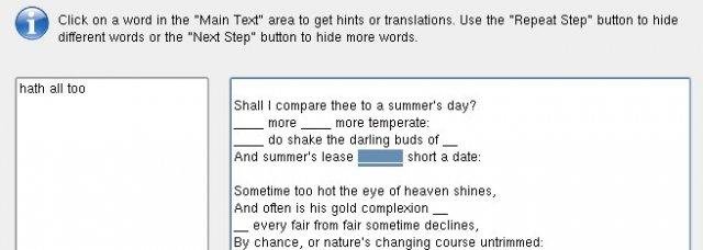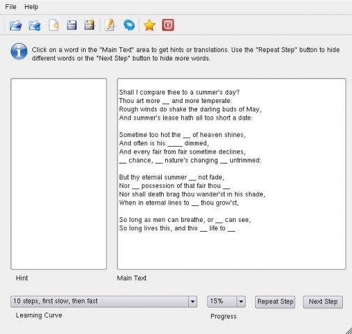 TextTrainer helps you memorise poems or plain texts in your native or in some foreign language. You learn by repeatedly reading aloud the text while more and more words randomly are hidden. Foreign language support includes grammar correction.