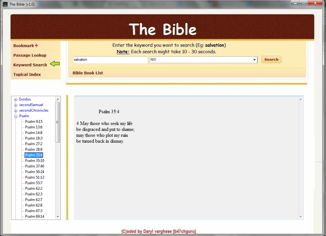 5. Keyword search feature which allows you to search for a specific keyword and get all the results in the bible.