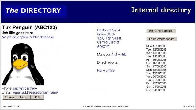 The DIRECTORY is a contact directory system for small/medium company intranets. As well as phone numbers, fax numbers and addresses, it has photos, reporting structure, and day-to-day whereabouts. It uses ASP web pages as a front-end to an ODBC database.
