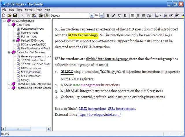 The Guide is a tree-based information management tool. It lets you to organize information as nodes in a tree. (A two-pane rich-text outliner for Windows.)
