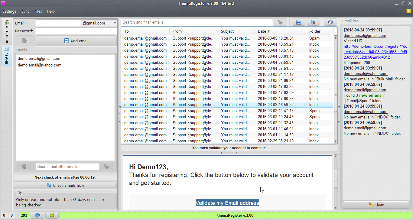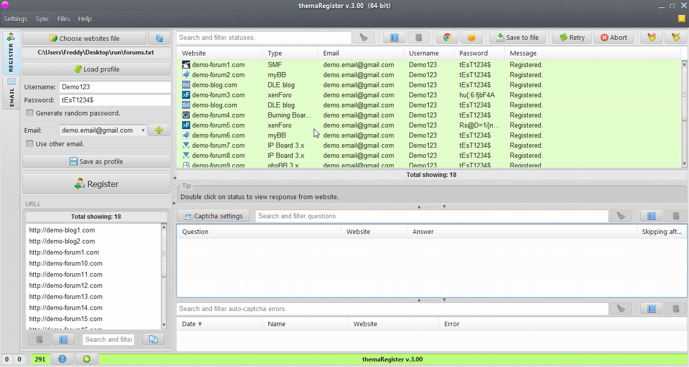 themaRegister is an auto register to forums and blogs. It has build-in email client, automatic account confirmation, captcha solving services support and more.