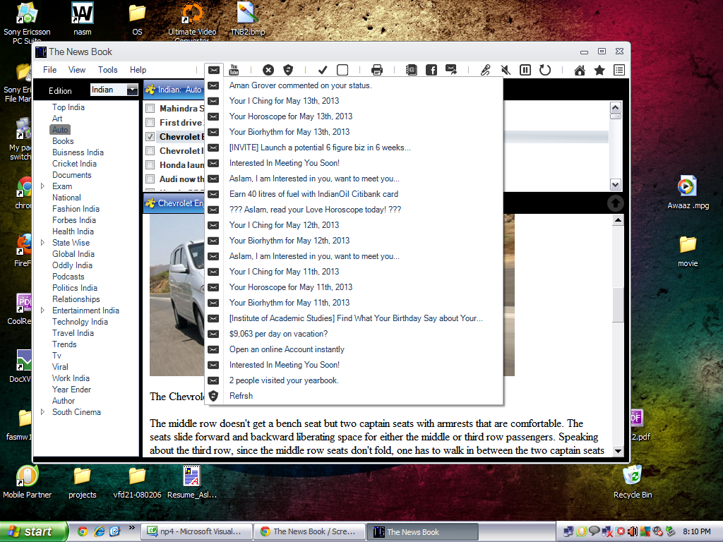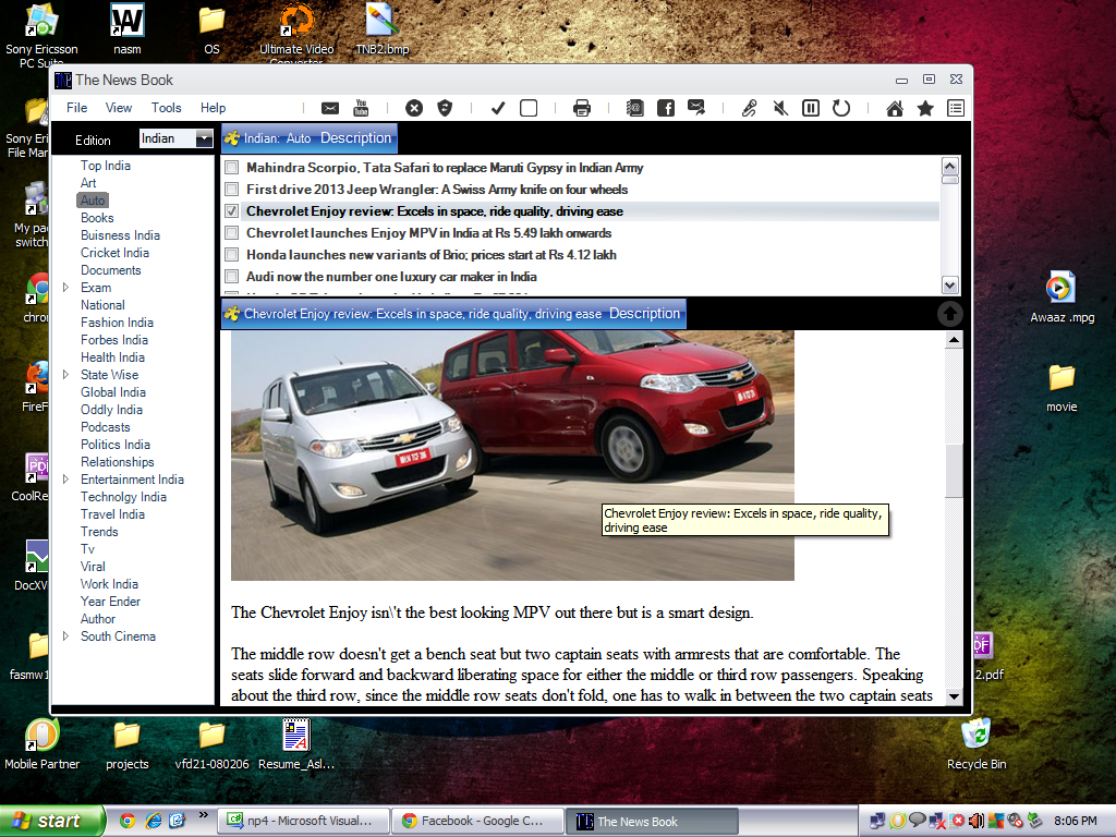 This Is A News Program Which Extracts Contents From Several News Websites, And Make Them Available For Share On Social Network Sites.Currently Supports Facebook, Working On More Social Networks.It Contains Some Other Features Like You Tube Client And You Tube Video Sharer On Social Networks And Blogs.A Gmail Client.Also Contains The Feature Of Bookmarks For Both You Tube Videos And News Articles.Bookmarks For News Articles Also Works Offline.The Program Maintains The Article Format According To The Websites.Also Supports NSM(News Speech Manager) Which Read The Articles Using The TTS(Text To Speech) Mechanism, Very Useful For Blind Peoples.Very Secure In Gmail Login Process, The Program Remember Password Only When It Is Running,And To Open A Mail You Have To Login First And Once Only, Automatically Sign Out From Google Account On Application Close.Contains A Smooth And Simple User Interface,Working On User Defined GUI. And Custom Themes.Developed By Free Tools Available On The Internet