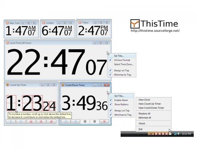 ThisTime is a simple clock and timer program. Create any number of clocks, count up or count down timers, each in its own resizable frame with a customizable title. Uses a digital time display that automatically scales to fit the window frame.