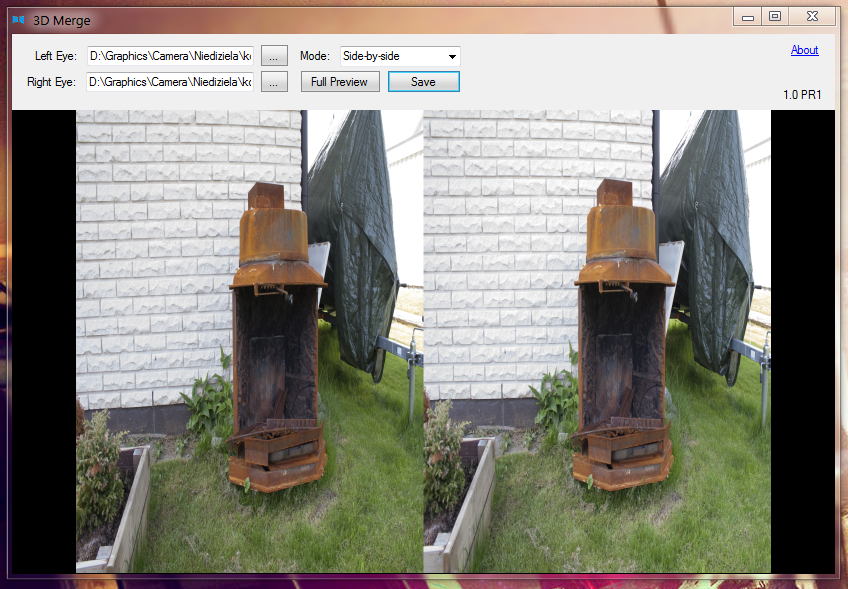 This simple program allows you to merge two 2D images, taken from different angles, into one 3D image. It does all resizing for you. You just need to specify witch images to use.