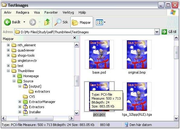 Add thumbnail support for .cut, .dcx, .dds, .mdl, .mng, .pcd, .pcx, .pic, .pix, .png, .pnm/.pbm/.pgm/.ppm, .psd/.pdd, .psp, .pxr, .sgi/.rgb, .tga/.vda/.icb/.vst, .tif/.tiff, .wal, and .xpm in MS-Windows XP Explorer! Or plug in your own image formats!