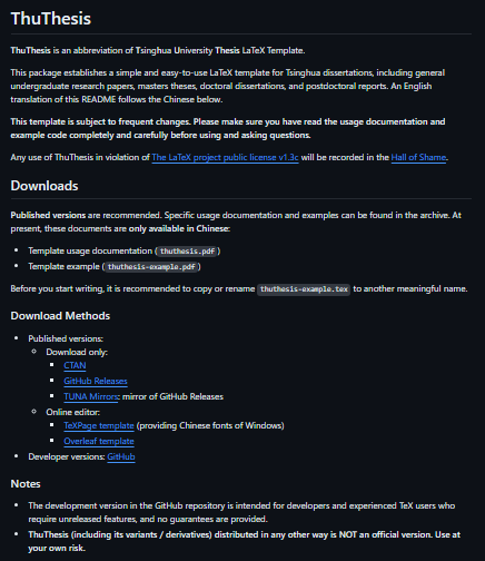 ThuThesis is an abbreviation of Tsinghua University Thesis LaTeX Template. This package establishes a simple and easy-to-use LaTeX template for Tsinghua dissertations, including general undergraduate research papers, masters theses, doctoral dissertations, and postdoctoral reports. This template is subject to frequent changes. Please make sure you have read the usage documentation and example code completely and carefully before using and asking questions.