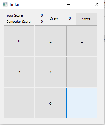 This is a tic tac toe game where a player plays against the computer. The player plays for crosses and the computer plays for noughts. See if you can beat this computer! You can check your stats anytime to see how many games you've played and the win rate of you or the computer.