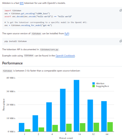 tiktoken is a high-performance, tokenizer library (based on byte-pair encoding, BPE) designed for use with OpenAI’s models. It handles encoding and decoding text to token IDs efficiently, with minimal overhead. Because tokenization is a fundamental step in preparing text for models, tiktoken is optimized for speed, memory, and correctness in model contexts (e.g. matching OpenAI’s internal tokenization). The repo supports multiple encodings (e.g. “cl100k_base”) and lets users switch encoding names to match different model contexts. It also offers extension mechanisms so that custom encodings can be registered. Internally, it includes the core tokenizer logic (often implemented in Rust or efficient lower-level code), APIs for encoding, decoding, and counting tokens, and binding layers to Python (and sometimes other languages) for easy use.