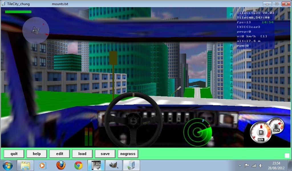Tilecity chung is a free car in the city building game from an openb3d demo by Ogg ( added car / flight / tank simulator + edit , load , save map + cars traffic + gui windows + heightmaps + cars racing + houses + trees + grass + skydome + sounds + performances boost + shooting + boats + tanks + redlights + stops + lamps + heighmaps edit, save, load). It is written in compiled freebasic and uses openB3D (open source blitzmax b3d game engine for freebasic). Source code is included in the zip file.Can run on a small netbook with windows 7. Create a map file (text 64x64) and explore a 3D openGL town with sea, towers, roads, highways, dirtways, relief, trees, houses, grass, airports . Drive cars among the town traffic , start races against computer driven cars, take a flight by plane to the airport or follow the other flying around cessna, pilot a tank or shoot them down.