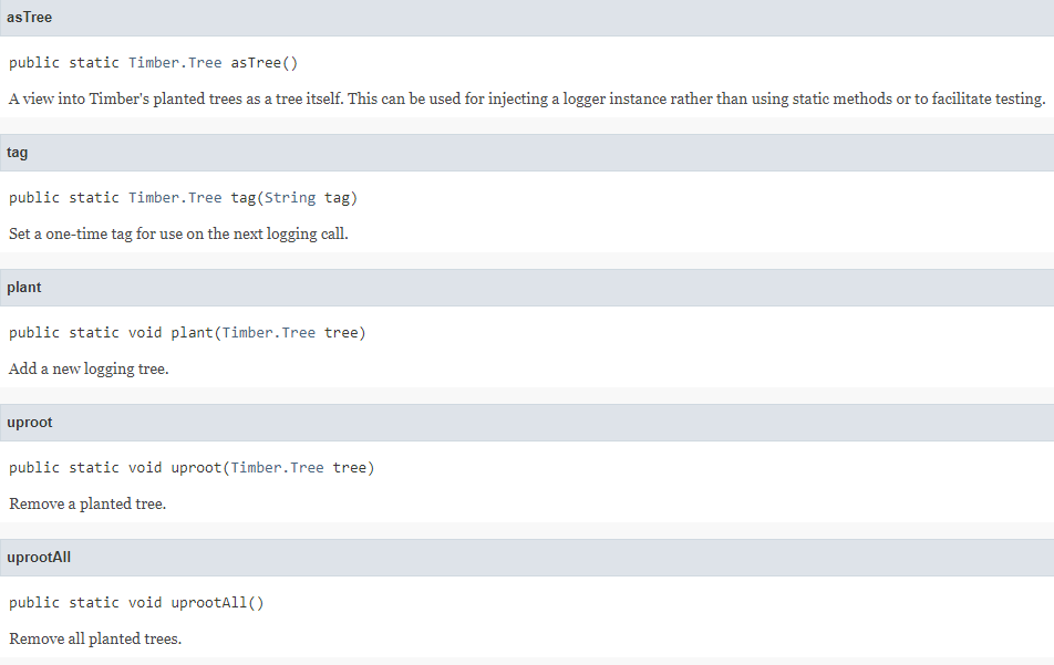 Timber is a logger with a small, extensible API which provides utility on top of Android's normal Log class. You can use this library and apply it into all the little apps you want to make. Behavior is added through Tree instances. You can install an instance by calling Timber.plant. Installation of Trees should be done as early as possible. The onCreate of your application is the most logical choice. The DebugTree implementation will automatically figure out from which class it's being called and use that class name as its tag. Since the tags vary, it works really well when coupled with a log reader like Pidcat. There are no Tree implementations installed by default. Timber ships with embedded lint rules to detect problems in your app. Timber detects the use of null or empty messages, or using the exception message when logging an exception.