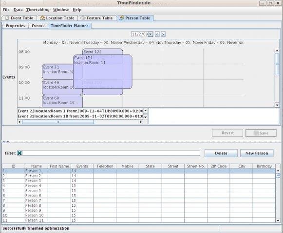 TimeFinder automatically optimizes schedules (timetables) for universities and high schools. It makes manual timetabling for the timetabler easier via a Java GUI. Export+import is supported via xml and text formats. http://timefinder.sourceforge.net/