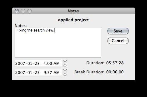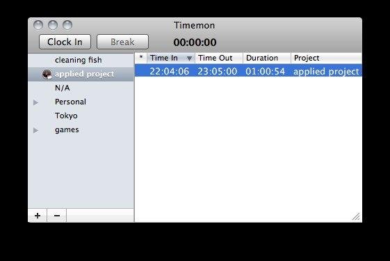 Timemon is a simple program used to keep track of the time you spend on various projects at work or home. Visual cues let you know if you are currently timing a project or on break. Easy editing of notes and adjustment of start and end time included.