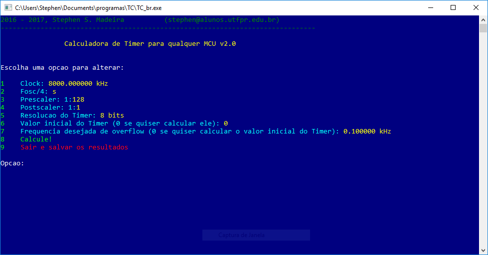 A simple program that calculates up to 6 parameters to help you using Timers. It is done to be used with ever single MCU (PIC, ATMEL, Freescale, etc) and plataform (Arduino, Raspberry, Edison, etc).