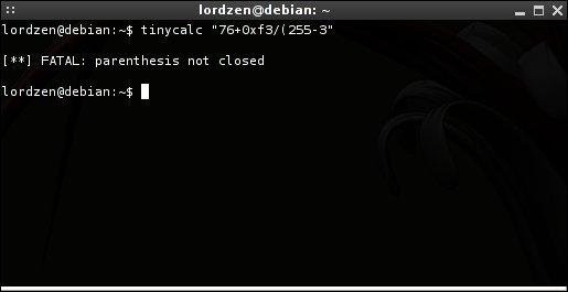 Tiny Calculator is a command line calculator for developers. It can resolve a complex expression mixing decimal, esadecimal an binary number. The result is automatic converted in decimal, esadecimal ad binary format.